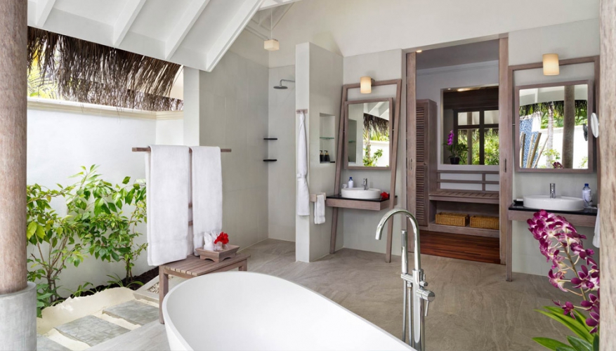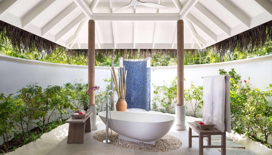 Villas in the Maldives highlight island beauty in full colour. The rear of your villa opens onto an extended outdoor bathroom and walled garden. Amidst the lush greenery, plunge into your private pool.