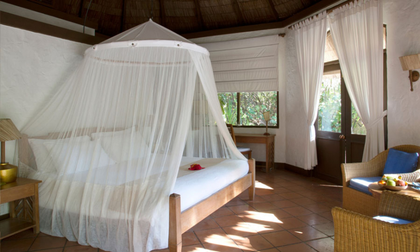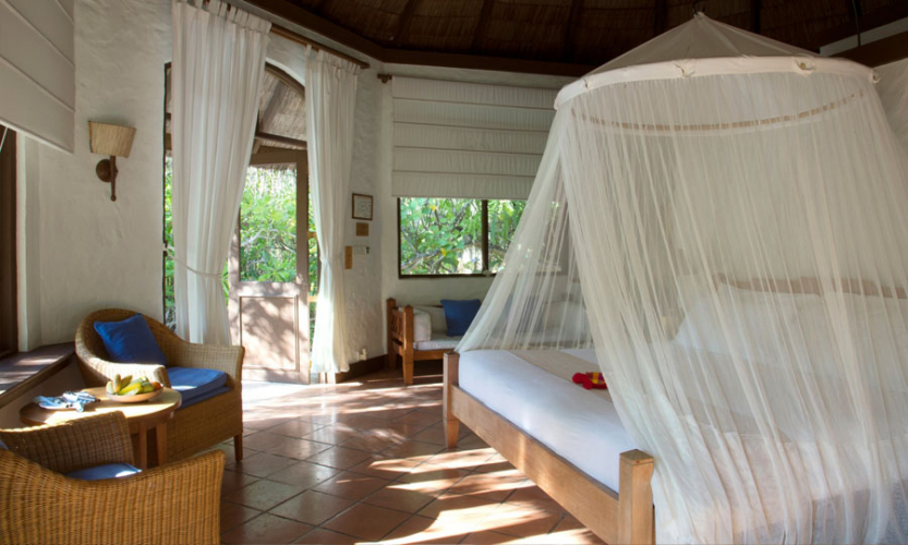 The sound of the thatch fringe and mature tropical plants and trees in the soft breeze perfectly captures the mood of island life. A walk along a short, canopied pathway lined with vibrant plants and trees leads to the largest stretch of beach on the island and the lagoon beyond.