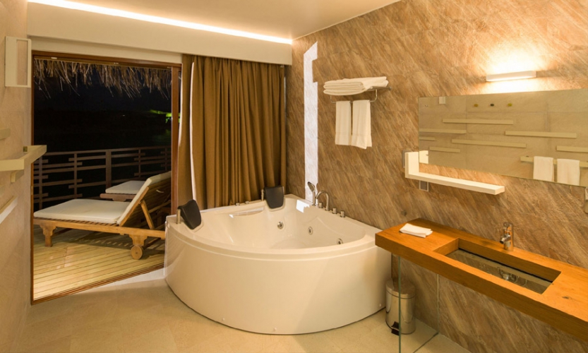 The mood for Cocoon Maldives is exclusive. Every element, from the complementary pieces and the fabrics for the curtains to the greenery, makes the perception of this space, sartorially designed, unique. From every point in the room guests are treated to views that maintain a constant visual relationship with the landscape. Materials and colours change in tune with the various sensations.