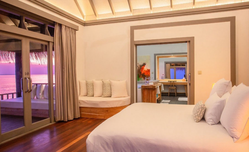 Perfectly perched right at the tip of the water villas. With a direct lagoon access, marvel at the expansive views of the Indian Ocean’s turquoise waters and two uninhabited islands. Floor-to-ceiling wooden doors within the lavish living area open to reveal an inviting infinity pool and an outdoor sundeck.