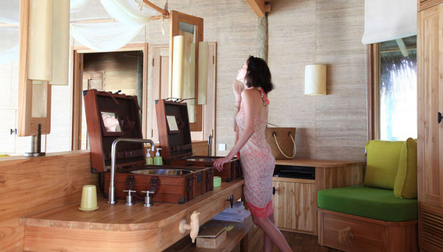 A short bicycle ride on the weathered timber jetties past the lagoon and towards the ocean blue, will lead you to these overwater retreats, secluded by high wooden enclosures. With direct access to the sea, you can jump in for a swim or for a snorkel around the lagoon or relax on the overwater netting hammock.